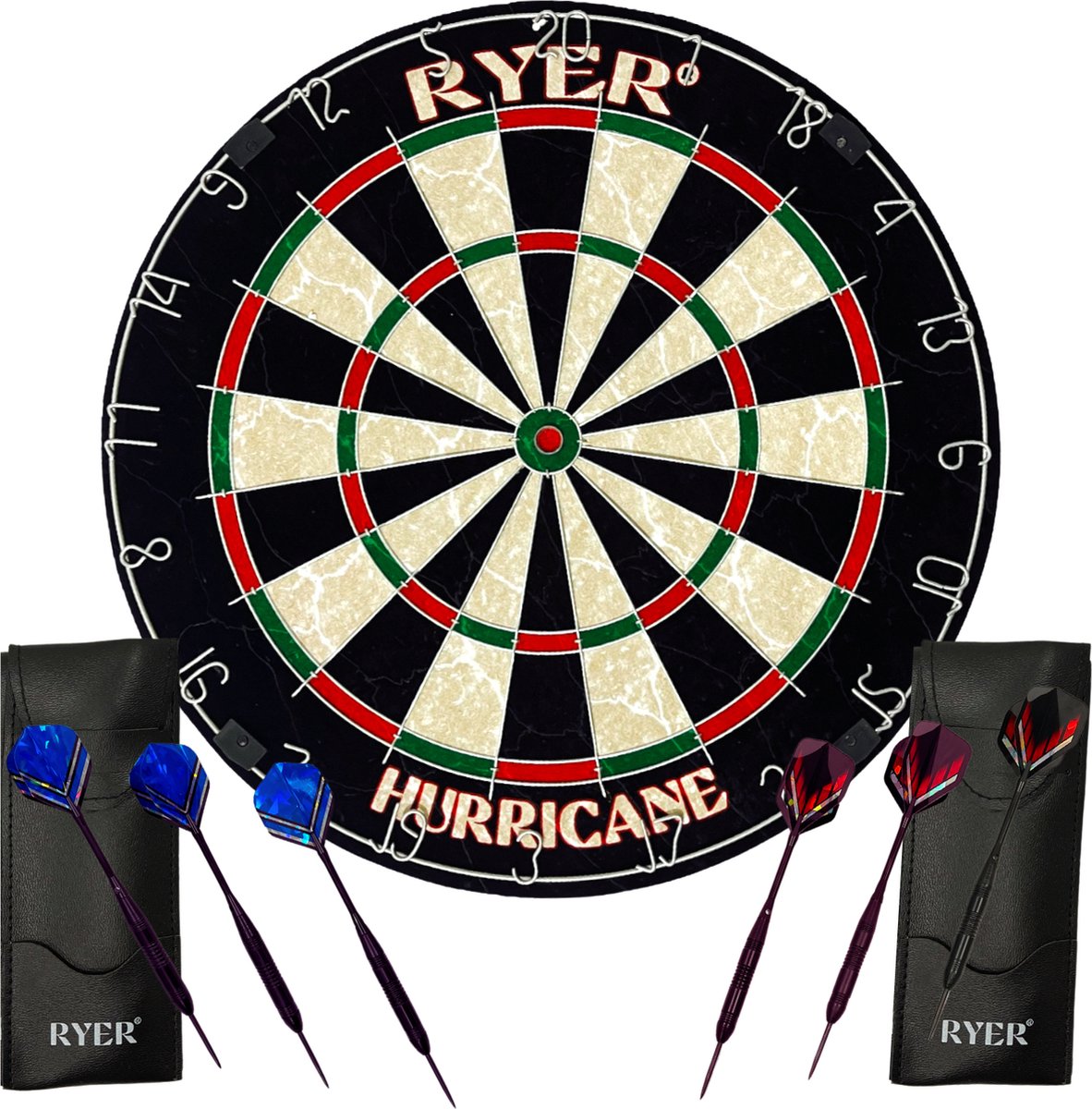 De RYER Hurricane set is een eersteklas dartbord dat perfect is voor ieder niveau. Het bord is gemaakt van zelfgenezend sisal, waardoor het een uitstekende kwaliteit en stevigheid heeft. De afwerking is afgewerkt met een afgeschuinde rand, waardoor het bord de perfecte vorm heeft voor een fijne worp. Ook is de set uitgerust met 6 professionele darts en 2 leren tasjes, waardoor je alles wat je nodig hebt in één handige set hebt. De RYER Hurricane set is gemakkelijk te monteren aan de muur, wat je urenlang dartplezier garandeert. Met deze set kun je met vrienden, familie of collega's urenlang genieten van een gezellig potje darten. En wanneer je je techniek wilt bijschaven, kan je het dartbord gebruiken om je skills te verbeteren. Met de RYER Hurricane set wordt je dartspel naar een hoger niveau gebracht.