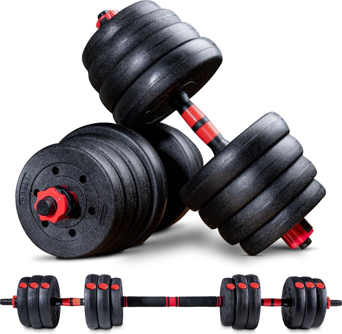De Umbro halterset is de perfecte oplossing voor alle fitnessliefhebbers. Heb je geen tijd om naar de sportschool te gaan, dan kun je gewoon thuis je work-out afmaken. De gewichten zijn gemaakt van kunststof, waardoor ze licht, stevig en duurzaam zijn. Je kunt de gewichten eenvoudig verstellen met behulp van de meegeleverde moeren. Door de twee stangen en de verbindingsstang kun je de set ook gebruiken voor krachttraining met een barbell. Met deze set heb je dus een compleet fitnesscentrum in huis.