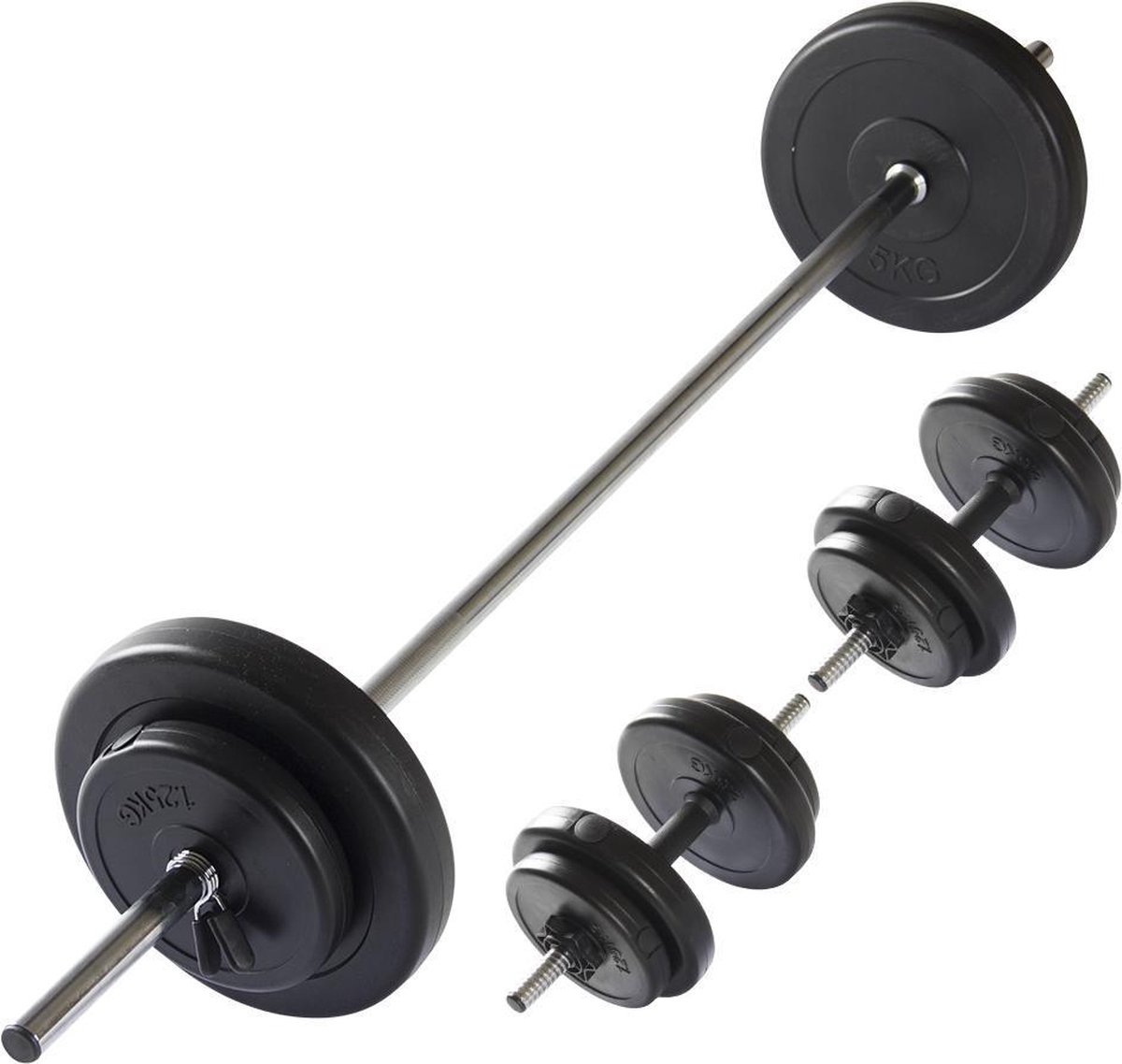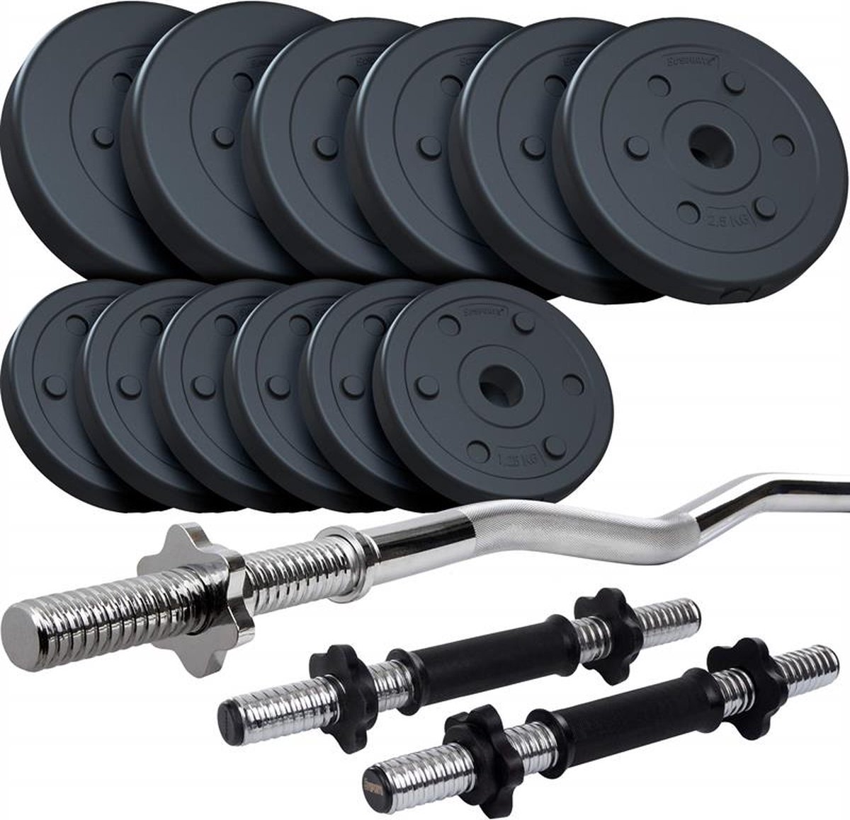 De ScSPORTS® Halterset 35 kg is een perfecte partner voor thuissporters die op zoek zijn naar een kwalitatieve, betaalbare set. Deze set bestaat uit twee korte halterstangen met een totaalgewicht van 35,5 kg, waaronder een curlstang en verschillende halterschijven. De halterschijven hebben een gewicht van respectievelijk 2 x 5 kg, 4 x 2,5 kg en 6 x 1,25 kg. De schijven zijn gemaakt van kunststof en hebben een dikte van 30 mm. Met deze set kun je thuis een effectieve en veilige kracht- en conditietraining uitvoeren. De schijven zijn eenvoudig te verwijderen en te plaatsen en hebben een antislip oppervlak. De stangen zijn gemaakt van hoogwaardig staal en zijn voorzien van schokabsorberende rubberen handgrepen voor een optimaal comfort. Dankzij het kleine formaat van de korte halterstangen zijn deze makkelijk op te bergen. Deze halterset is een ideale keuze voor thuissporters die op zoek zijn naar een kwalitatief goed en betaalbaar set.