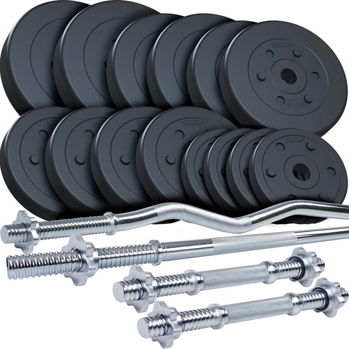 ScSPORTS® Halterset is een ideale set voor iedereen die graag krachttraining doet. De set bestaat uit kunststof halterstangen en halterschijven met een diameter van 30 mm. Je kunt kiezen uit verschillende gewichten en zo je halterset aanpassen aan je eigen behoeften. De set heeft een totaalgewicht van 80 kg en is daarom geschikt voor thuisgebruik. De halterset is gemaakt van hoogwaardige materialen, waardoor hij een lange levensduur heeft. Daarnaast is de set waterbestendig, waardoor je de set zowel binnen als buiten kunt gebruiken. De halterset is eenvoudig in elkaar te zetten en biedt een uitgebreide oefeningenbank voor je krachttraining. De schijven zijn gemaakt van een duurzaam kunststof en hebben anti-slip touches, waardoor je een optimale grip hebt. Zo geniet je tijdens je training van optimale veiligheid.