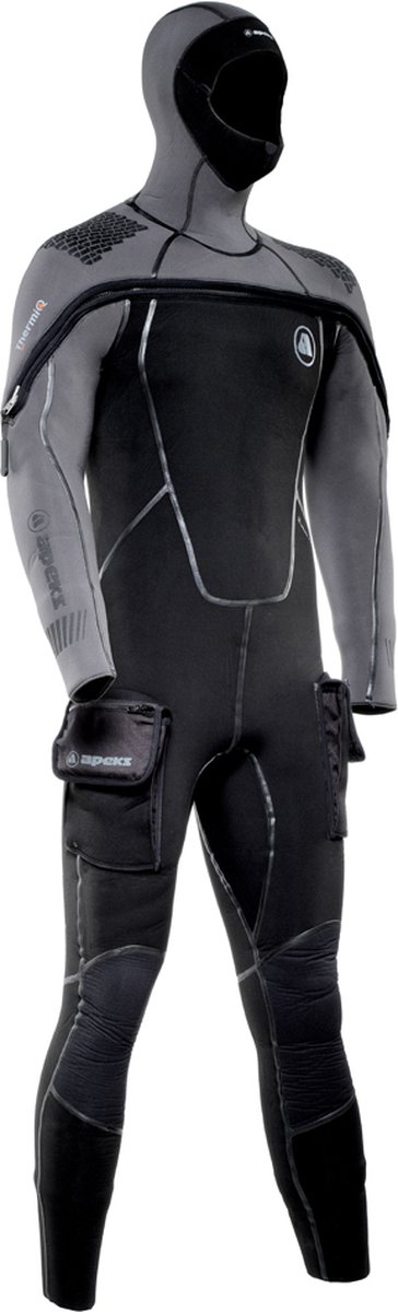 Productnaam: Apeks ThermiQ Adv Jumpsuit 8mm Semidroog Duikpak. Productbeschrijving: De Apeks ThermiQ 8/7 is een luxueus duikpak dat warmte, flexibiliteit en de beste kwaliteit eco-neopreen combineert. Het pak is ontwikkeld voor gevorderde duikers die op zoek zijn naar top-end comfort en prestaties. Als het gaat om milieubescherming, bevat het neopreen op basis van kalksteen en een voering gemaakt van gerecyclede plastic flessen. Het duikpak heeft een 8mm dikke kern die extra thermische bescherming biedt waar dat het meest nodig is en 7mm op de armen en benen voor flexibiliteit. Met grote cargo zakken om je accessoires op te bergen en een geïntegreerde capuchon voor extra warmte, is het pak gemakkelijk aan te trekken door middel van een rits over de borst. Tevens heeft het interne manchetten op de onderarmen en onderbenen om waterinfiltratie te minimaliseren. Met de gratis omkleedmat om je voeten en wetsuit te beschermen tijdens het omkleden, is de Apeks Thermiq 8/7 een duikpak waarmee je comfortabel op avontuur kunt gaan.