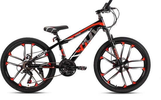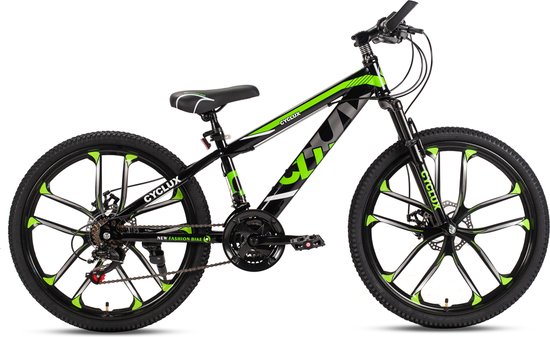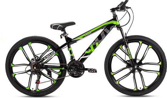 De CYCLUX New Fashion Mountainbike 24 inch is een moderne jongensfiets die voorzien is van vele moderne technologieën. Met de geveerde voorvork kun je prima crossen over een zandpad. Daarnaast is het hoge stuur een prettige zithouding en daarmee lijkt deze fiets al een stuk groter. Met de lichtgewicht Aluminium Frame kun je ondertussen ook nog eens erg snel fietsen. De 21 versnellingen Shimano voorzien de fiets van veel kracht en hierdoor kun je ook heuvels beklimmen zonder problemen. De Mechanische schijfremen staan bekend om hun krachtige remprestaties waardoor ook een noodstop maken geen enkel probleem is. Daarnaast zorgen de twee dubbele handremmen voor een fijne en betrouwbare aanvulling. Kortom, de CYCLUX New Fashion Mountainbike 24 inch is een stoere jongensfiets die klaar is voor alle avonturen. Plezier gegarandeerd dus!