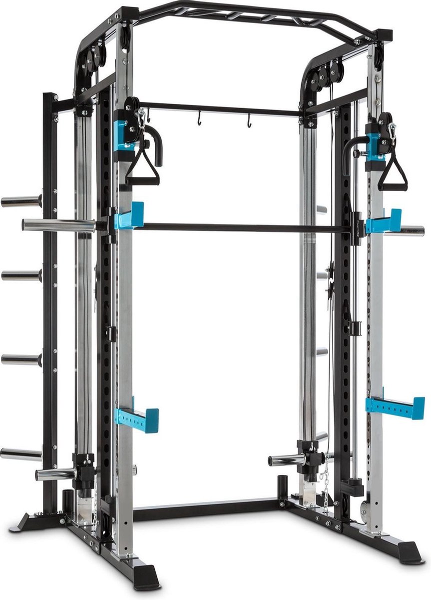 Met de Tremendour Plus power rack van Capital Sports krijg je de ideale multifunctionele trainer voor je homegym. Deze power cage is volledig gemaakt van massief staal en is uitermate geschikt om ernstige spieropbouw te bevorderen. De twee Safety Spotters aan beide zijden van de kooi kunnen hoogte-instellingen aannemen in een bereik van twintig posities, waardoor het rek makkelijk op de individuele behoeften kan worden ingesteld. De dipsstangen die bij de power rack worden meegeleverd, kunnen in de rechtse Safety Spotter worden bevestigd. Bovendien heeft de power rack een dubbele stang met verticale en hellende connectors, waardoor de pull-up bar een gevestigde waarde wordt. Met de Tremendour Plus power rack van Capital Sports krijg je dus een ideale multifunctionele trainer voor je homegym. Deze power cage is een stevige basis voor oefeningen met gewichten en halters, waarbij je veilig alleen kunt trainen. De Safety Spotters kunnen eenvoudig op de individuele behoeften worden ingesteld, terwijl de bijgeleverde dipsstangen en de pull-up bar een gevestigde waarde zijn. Met deze power rack kun je dus al je spieropbouw-oefeningen op een veilige manier uitvoeren.