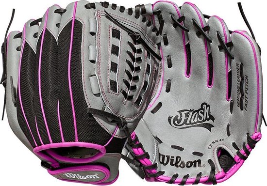 De Wilson Honkbal MLB Softbal Handschoen A400 Flash is ideaal voor beginnende softbal spelers. De handschoen is vervaardigd uit een combinatie van leer en geweven materiaal en is speciaal ontworpen voor de kleinere handen van de jeugd. De handschoen is 11,5 inch en heeft een gesloten back met een klittebandsluiting. De kleuren zijn zwart, grijs en paars. Er is geen break-in vereist, de handschoen is al helemaal soepel. De handschoen is geschikt voor de posities binnenveld, buitenveld en pitcher. De Wilson A400 Flash is perfect voor jonge softbal spelers van 8 tot 12 jaar.