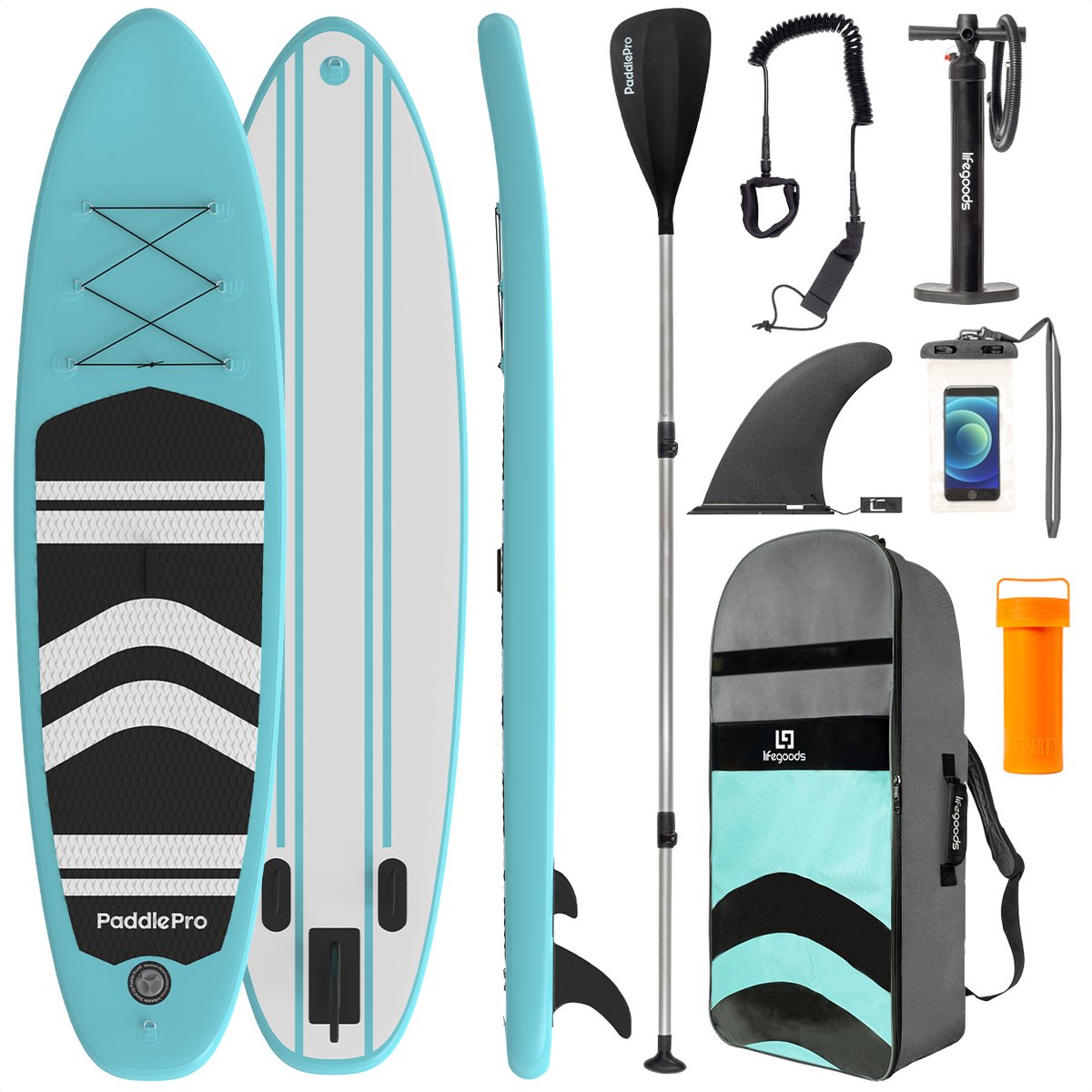 Geniet van een dagje op het water met het LifeGoods SUP Board. Deze opblaasbare paddle board heeft een maat van 320 x 81 x 15 cm en weegt slechts 8,5 kg. Met de meegeleverde pomp is het board binnen 5 minuten klaar om mee te nemen. De aluminium peddel is uitschuifbaar van 175 tot 215 cm en de vinnen en het non-slip oppervlak zorgen ervoor dat je altijd stabiel staat. Met een maximaal draagvermogen van 135 kg is het board geschikt voor zowel zout als zoet water en geschikt voor elk niveau. De mooie mintgroene kleur maakt dit SUP board een echte eyecatcher. Geniet van een avontuur op het water met het LifeGoods SUP Board!