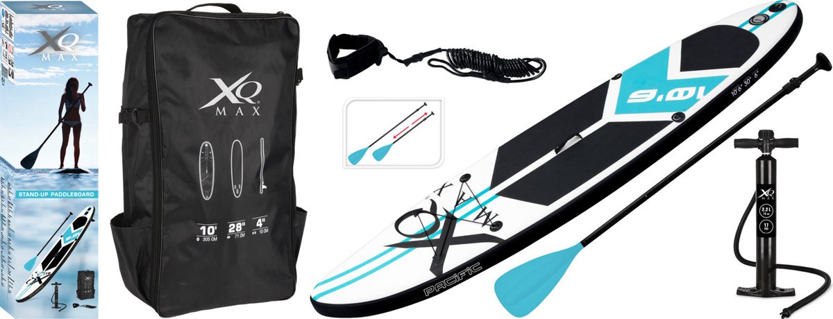 XQ Max 305 sup board set is de perfecte optie voor een dagje watersport. Het board is gemakkelijk op te blazen, waardoor het board eenvoudig meegenomen kan worden. Bovendien is het board voorzien van een speciale antislip bekleding, waardoor je stevig staat. Ook is het board voorzien van D-rings waar een stoeltje aan bevestigd kan worden. Dankzij de bijgeleverde accessoires zoals een rugtas, een handpomp, een verstelbare paddel, een afneembare vin, een enkelband, en een reparatiekit, heb je alles wat je nodig hebt voor een dagje watersport. Laat je meevoeren op het water met het XQ Max 305 sup board set opblaasbaar 305 CM.